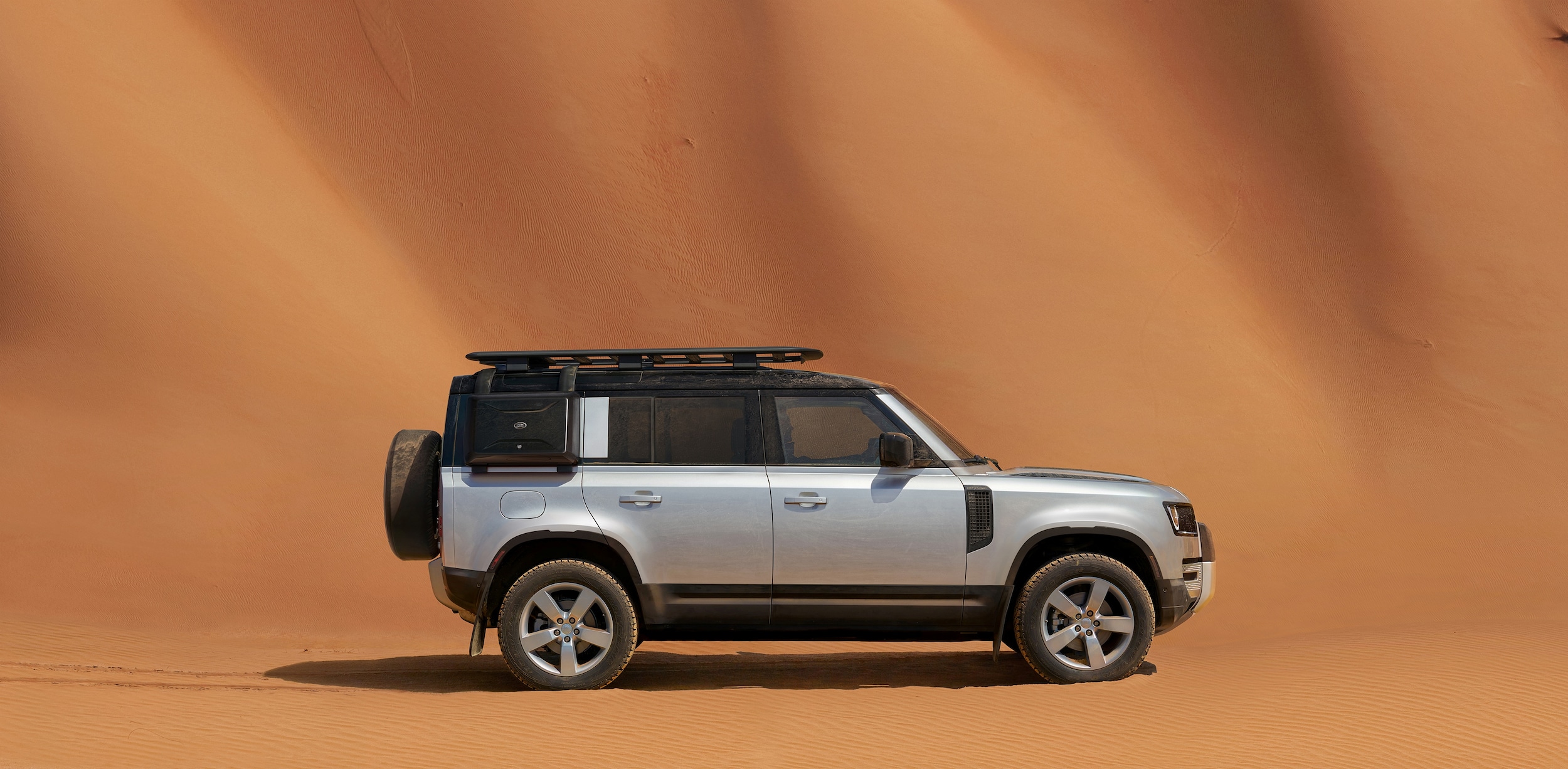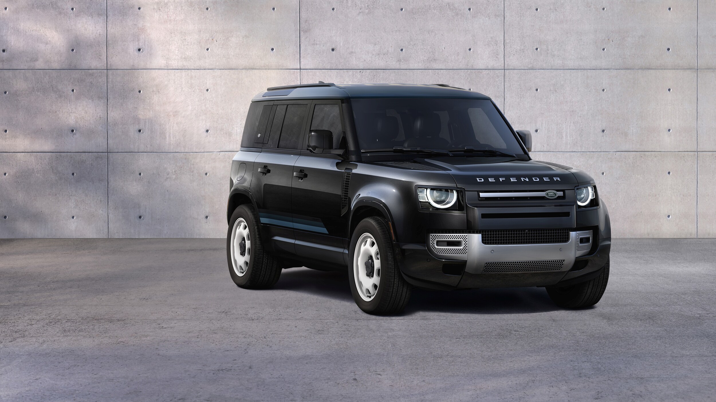 - Defender 110 V8: 518 horsepower supercharged eight-cylinder, 22-inch gloss black wheels, quad tailpipes, Windsor leather & Kvadrat seat trim